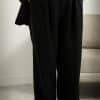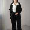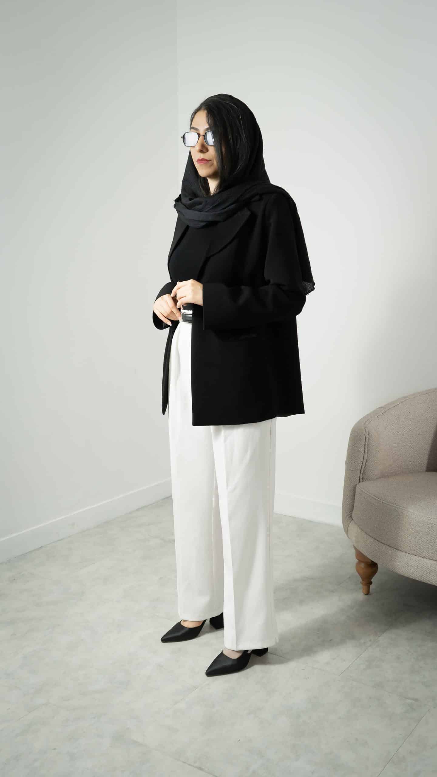 کت زنانه این ست با برشهای دقیق طراحی شده است. فرم آن بر اندام زنانه تاکید دارد. یقه و دکمهها ظاهری کلاسیک ایجاد میکنند. شلوار طراحی آزاد اما متناسب دارد. ترکیب این دو بخش، هماهنگی و زیبایی را کامل میکند.